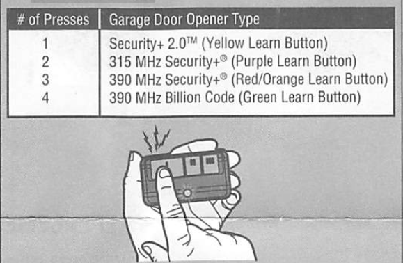- Press and release the remote control button you wish ot use the number of times that corresponds with the garage door opener type: