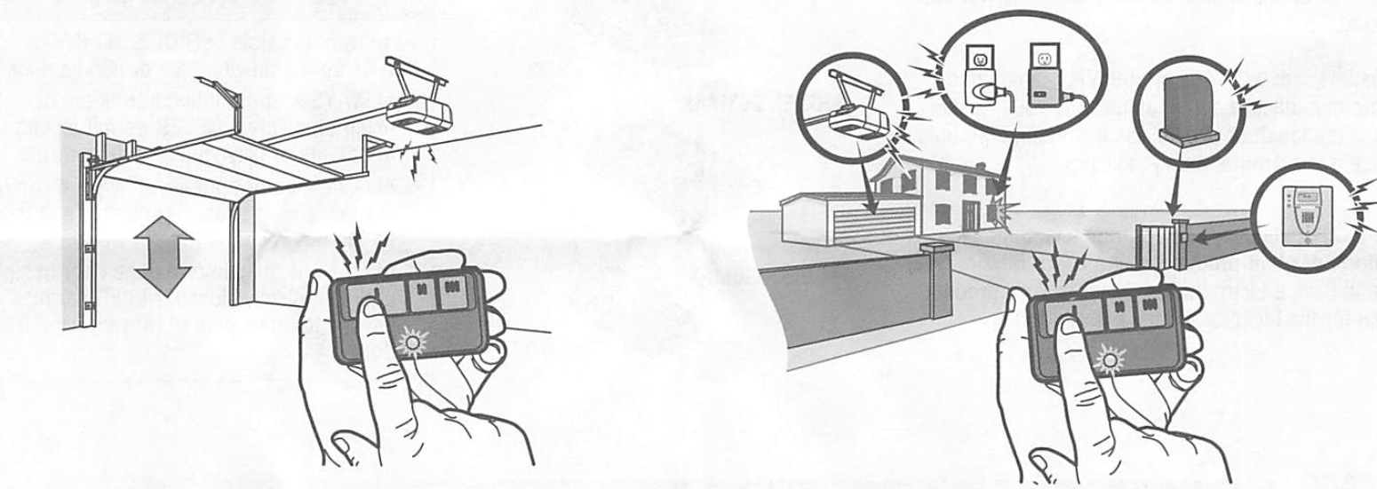 Press and hold the button down until the door or gate starts ot move. The remote control will operate from up to 3 car lengths away on typical installations. Installationsand conditions vary, contact an installing dealer for more information. Additional buttons on the remote control can be programmed to operate up to 3 devices such as additional garage door openers, light controls, gate operators or access conrtol systems.