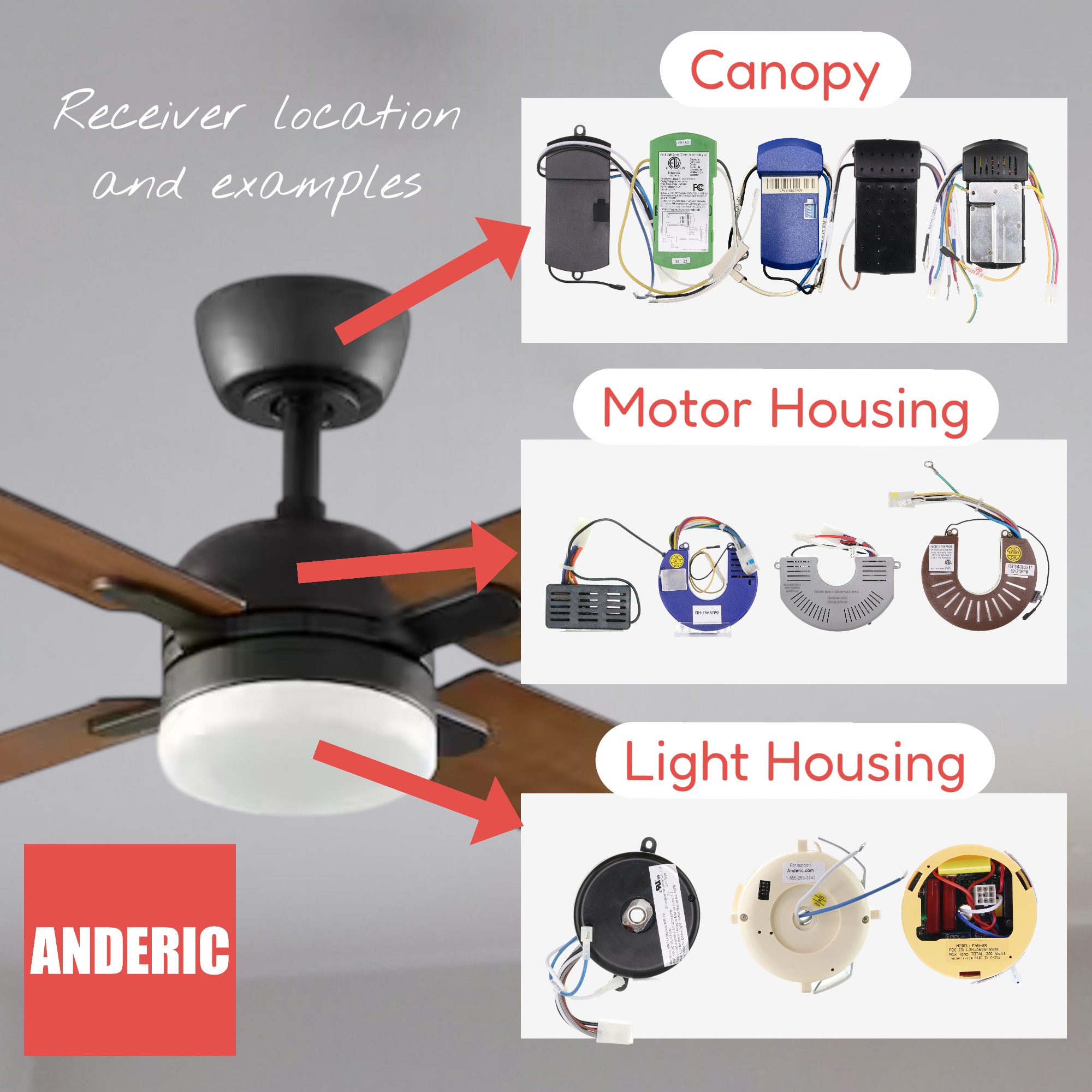 If you need to replace your ceiling fan receiver or simply find it. Please see the image below of where the receiver styles are located with example receivers.
