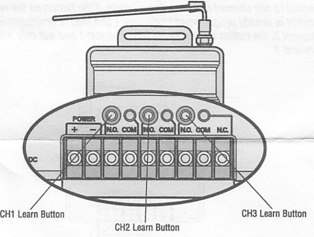 - Press and hold the CH3 Learn button on the receiver, LED on.