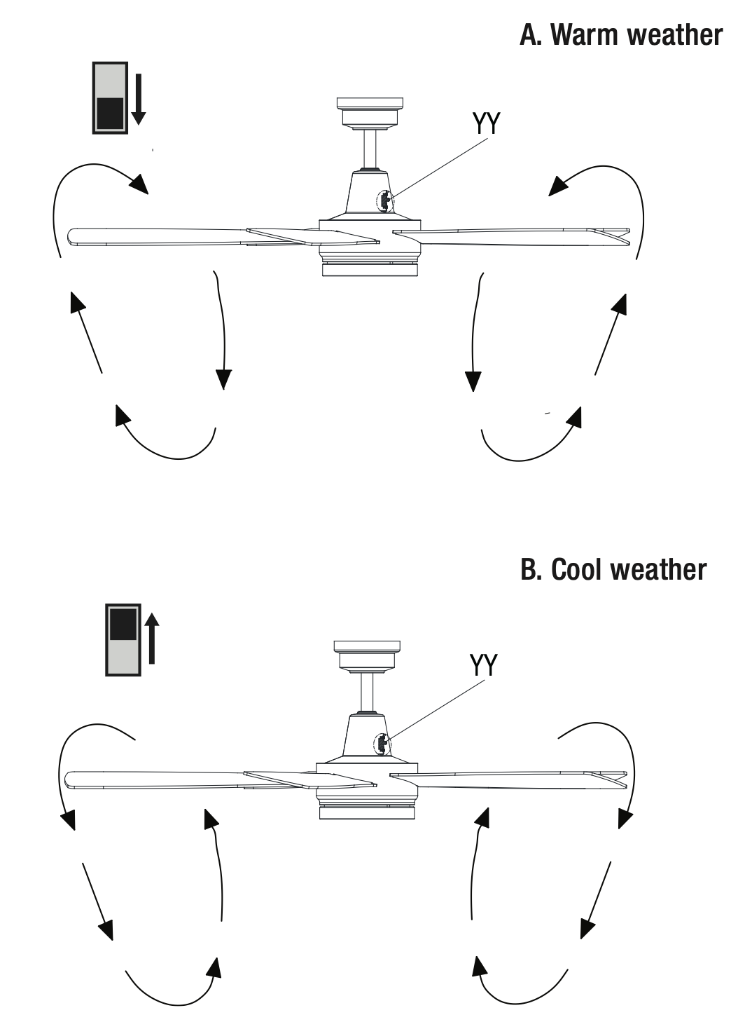 If you want the airflow to go in the opposite direction, simply turn off your fan and wait for the blades to stop spinning. Then, find the reversing switch (located underneath the motor collar cover on the switch box on top of the motor housing), slide it to the opposite position, and turn the fan on again. VoilĂ ! The fan blades will now spin in the opposite direction, creating reverse airflow.