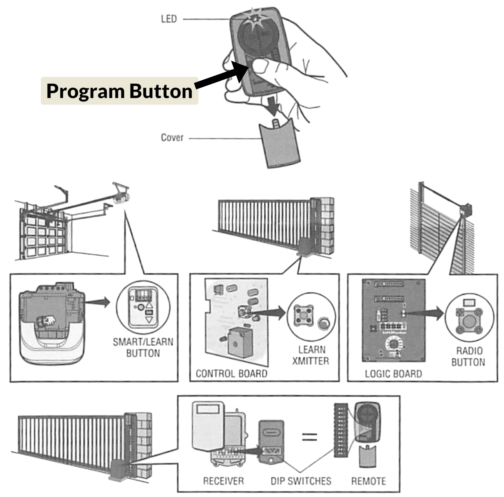 - The SMART/LEARN button or DIP SWITCHES are located either on the product or in an external receiver on or near the product. Consult your product owner's manual to locate the SMART/LEARN button or DIP SWITCHES.