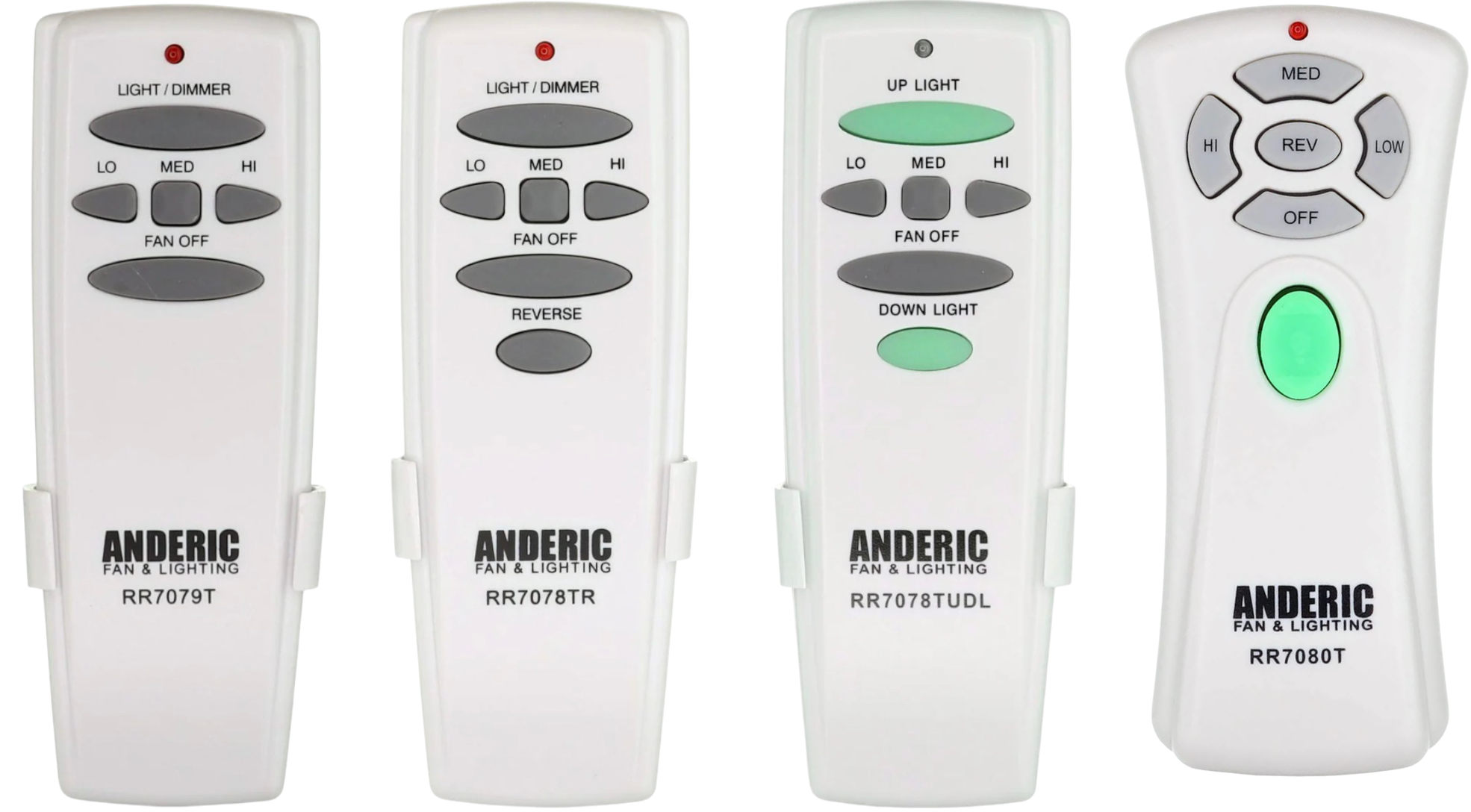 This article applies to the Anderic RR7079T, RR7078TR, RR7078TUDL, and RR7080T ceiling fan remote controls.